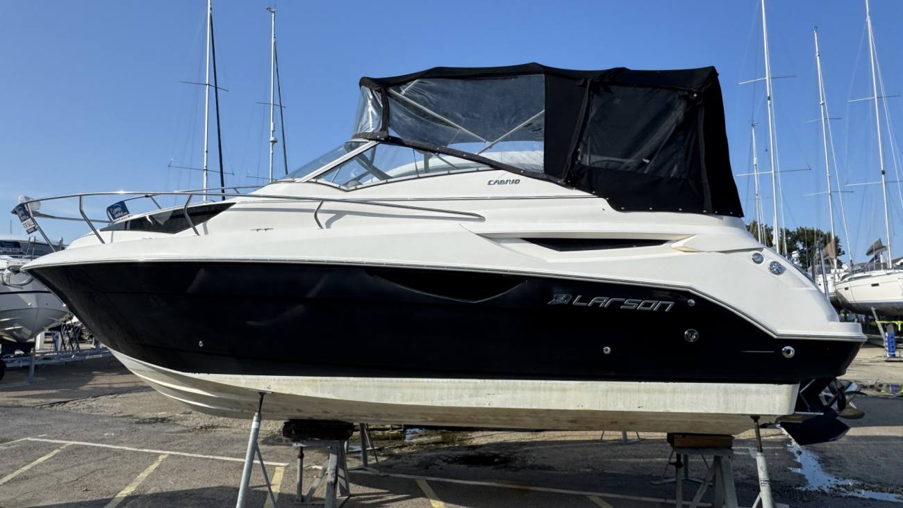 2012 Larson 265 Cabrio fitted with a Mercruiser 350 MAG MPI (300hp) with a Bravo 3 drive. This 265 Cabrio has just arrived here in Swanwick Marina and is awaiting preparation. She has a great spec including full camper hood, underwater lights, GPS plotter, cockpit wetbar with sink and Igloo, galley fridge, ceramic hob, electric toilet etc.