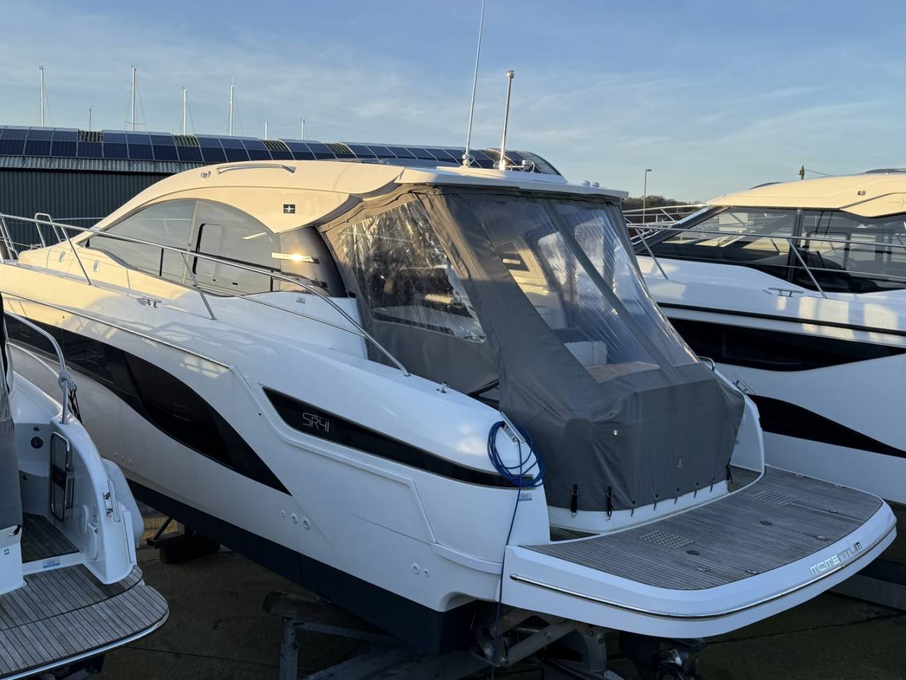 2022 Bavaria SR41 fitted with twin Volvo Penta D6-380 engines with DPI sterndrives (2 x 380hp) with approximately 96 hours and joystick control. This Bavaria SR41 is in fantastic condition and was delivered in early 2022. She has a great specification including hydraulic bathing platform, heating, Simrad 9" plotters (x2), electric fabric roof, Oak internal joinery, Suntex diamond stitch cockpit upholstery etc etc.