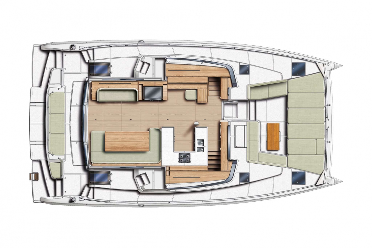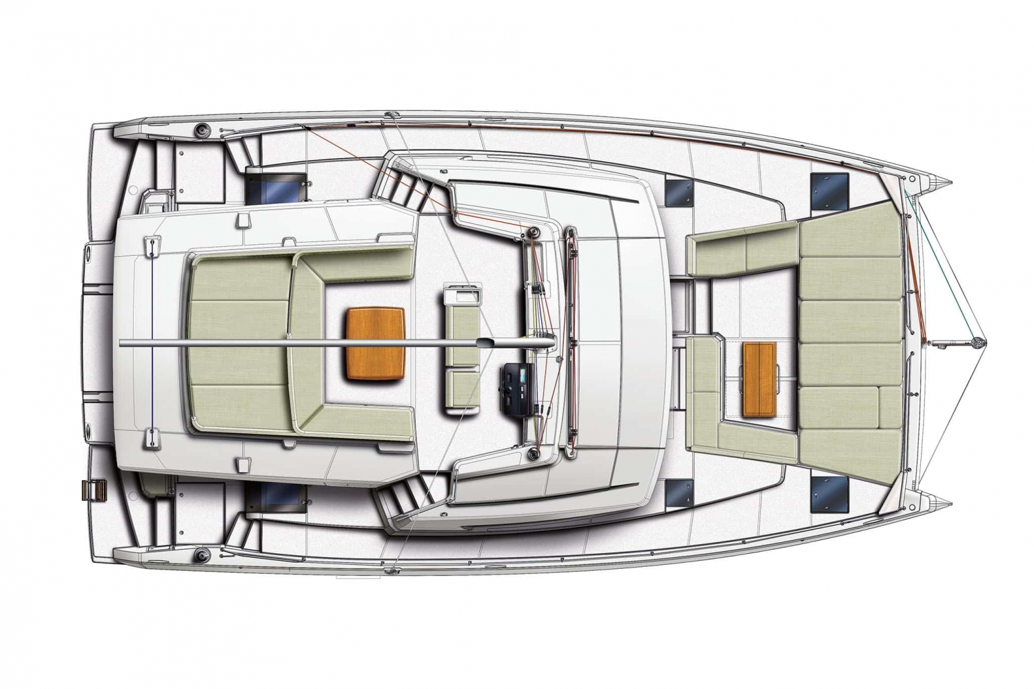 A large tilting door opens up the living space to the sea, while the solid deck of the forward cockpit boasts spacious seating areas and wide sliding windows that let in plenty of light and provide a great view. On the flybridge, a lounge, wetbar and sunbathing area invite you to make the most of your trip.