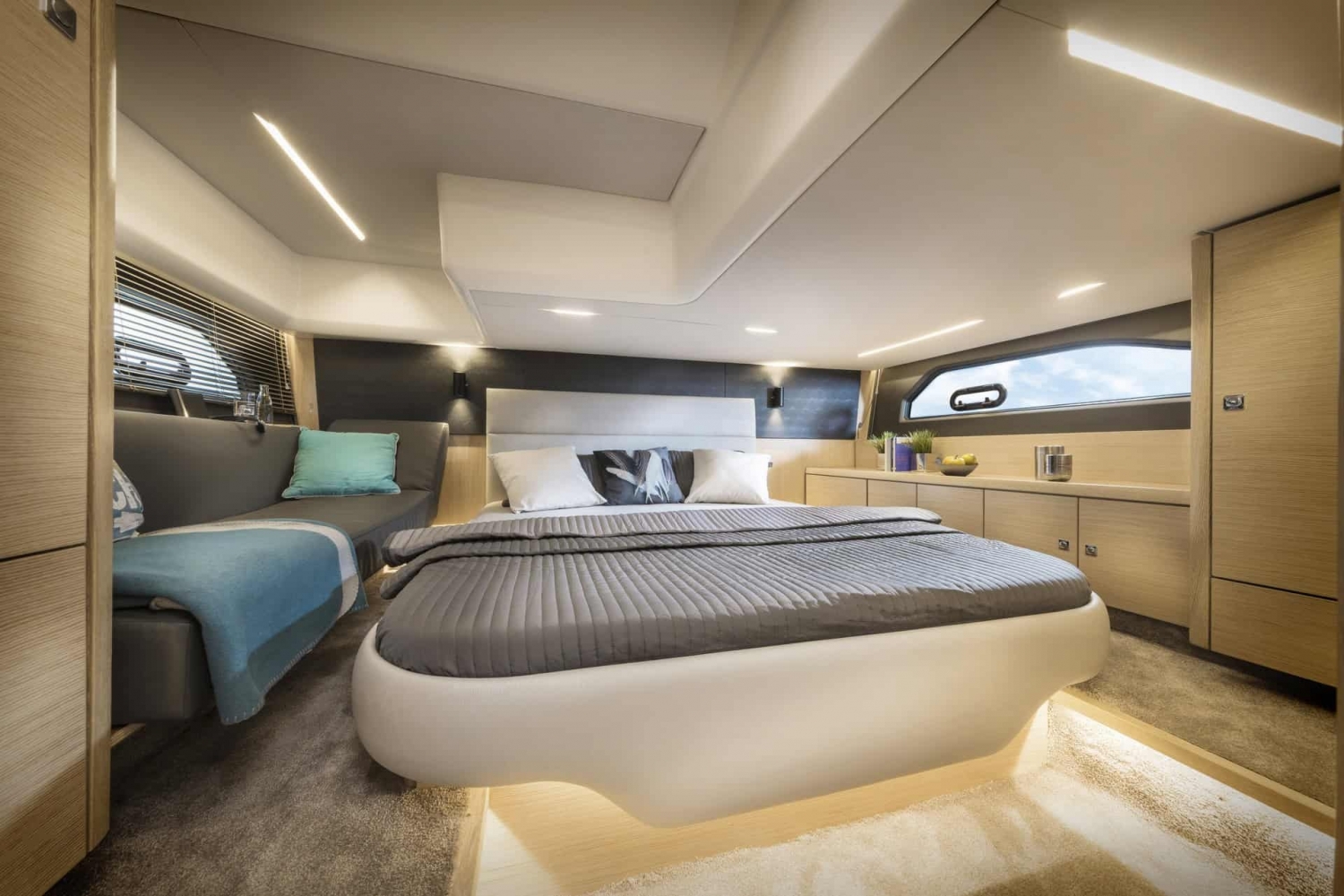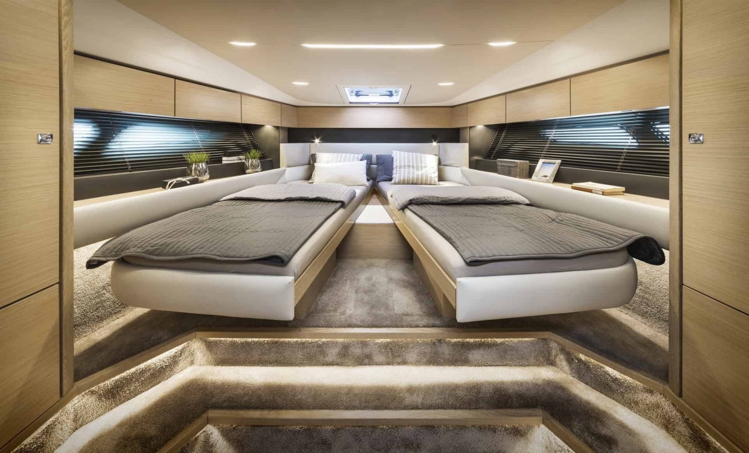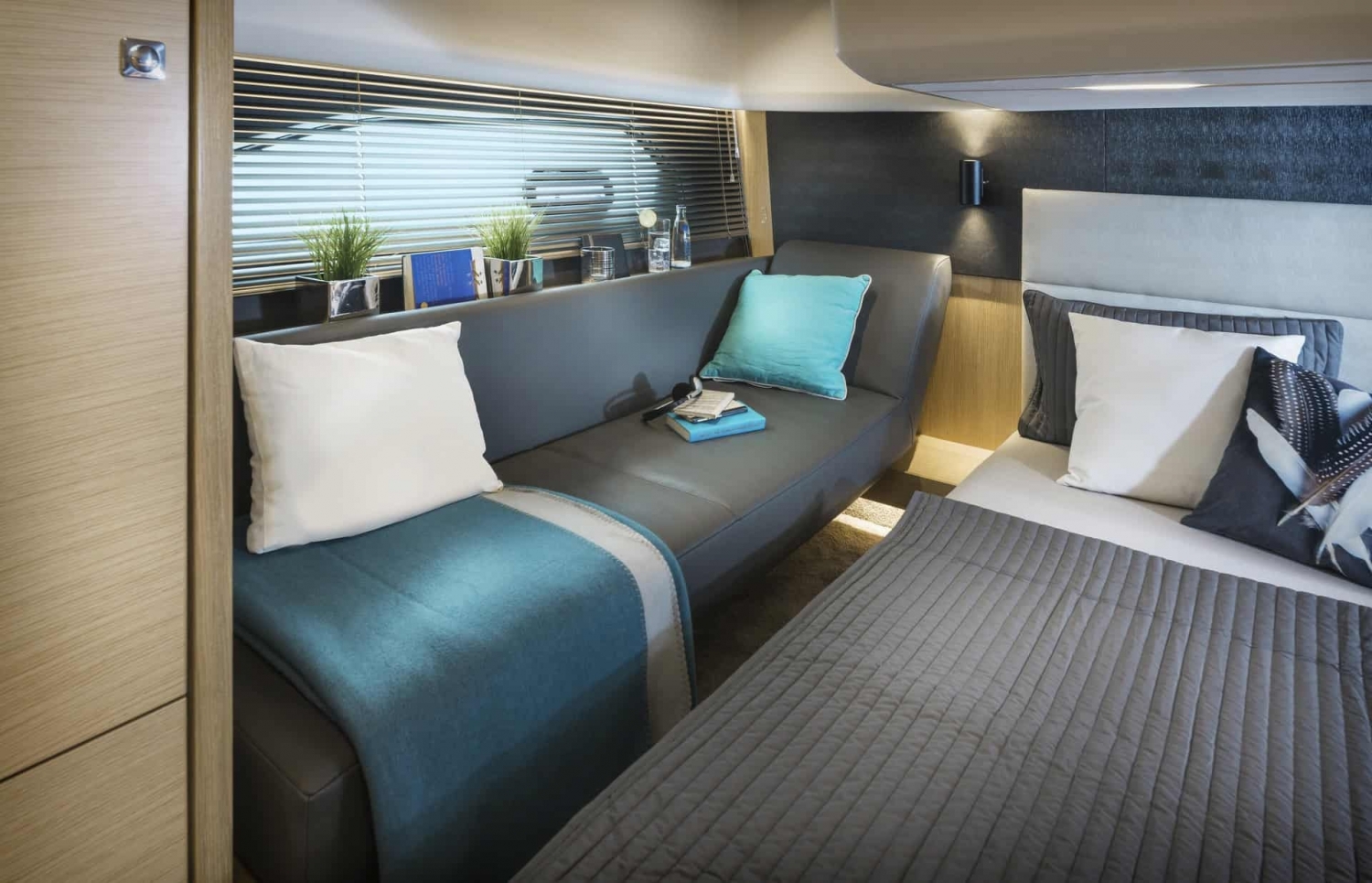 The BAVARIA R40 has two suites with king-size beds with lovingly crafted wood finishes. Each has its own bathroom with separate showers and porcelain washbasins. The owner’s cabin aft also offers an elegant sofa for rest and relaxation. The guest cabin has a special feature thanks to a clever mechanism that converts the double bed into two single beds.