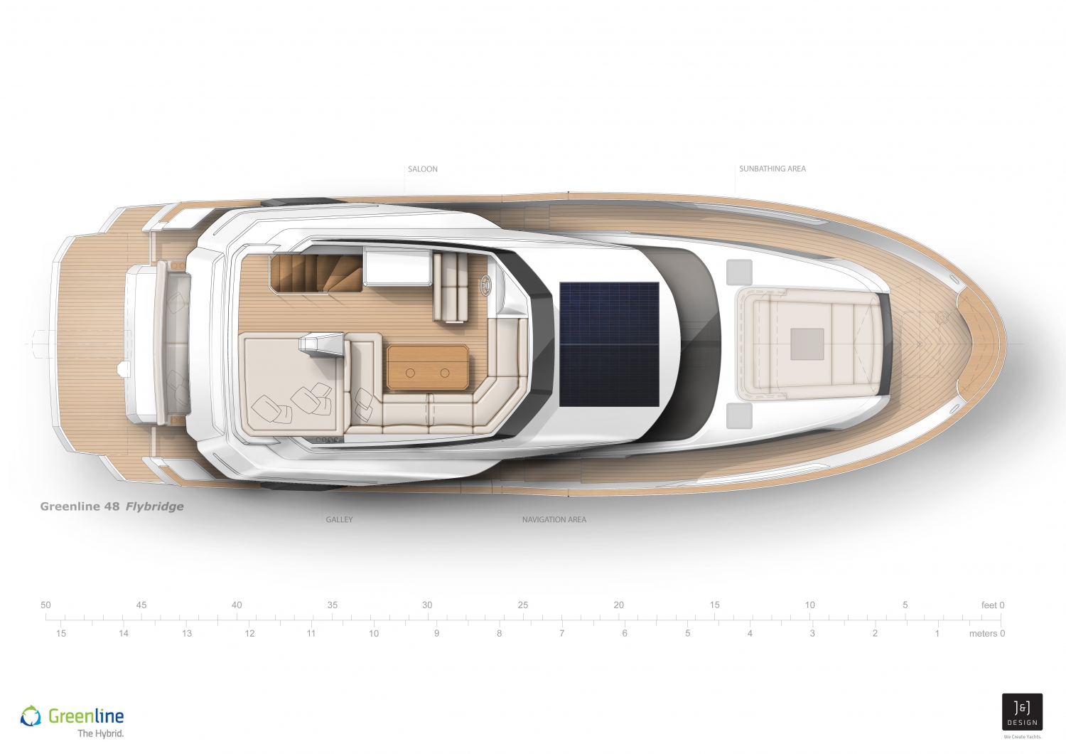 The Greenline 48 has three different entry height levels (stern platform, side exit, bow), allowing you to always board and disembark safely. It offers one of the largest and most comfortable flybridges in her class, featuring a wet bar with grill, U-shaped settee and sunbathing area.