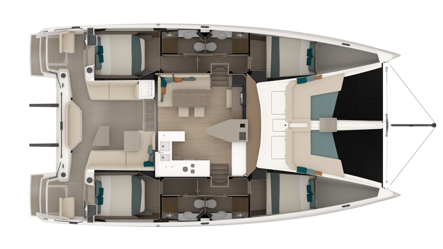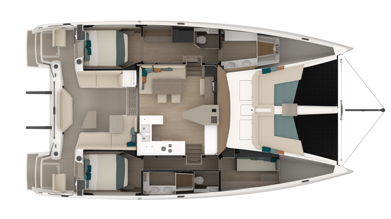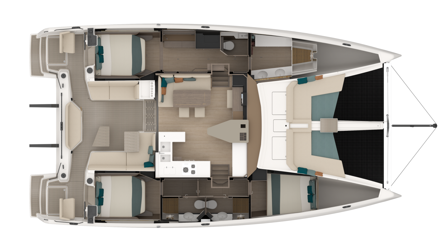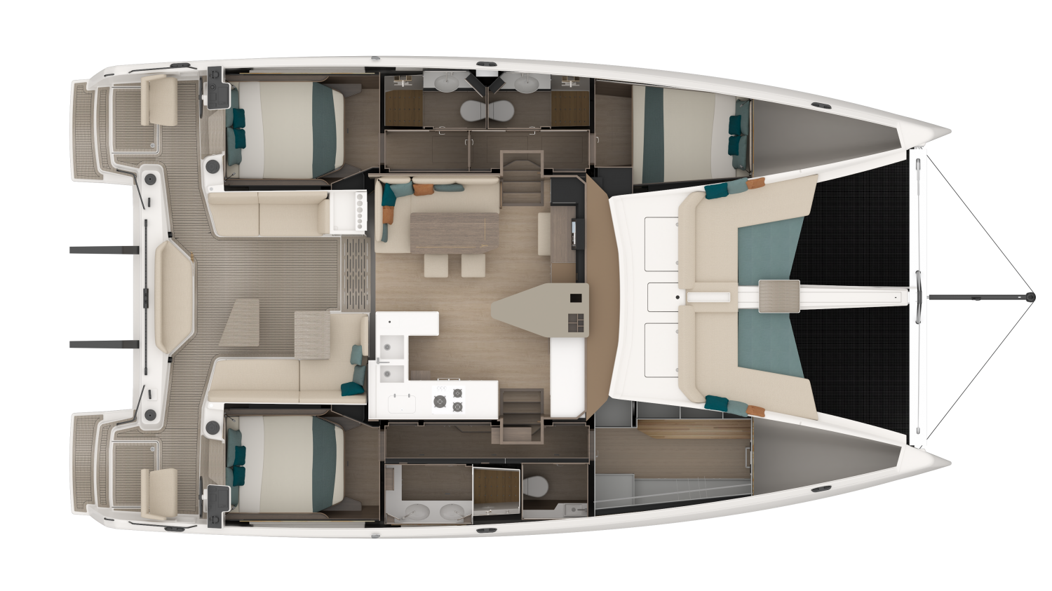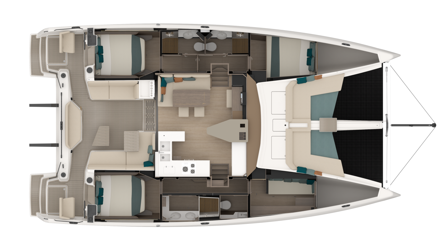Designed by MLYDG, the 48 Open benefits from the latest advances in hydrodynamic performance to ensure the best balance between performance under sail and comfort in the hulls. Nothing has been left to chance in the design of this top-of-the-range boat to combine comfort, feeling at the helm, and ease of maneuvering whatever the conditions. The height of the bridgedeck, the slenderness of the hulls, the sail area, and the control of the displacement, all these elements contribute to a well-balanced boat.