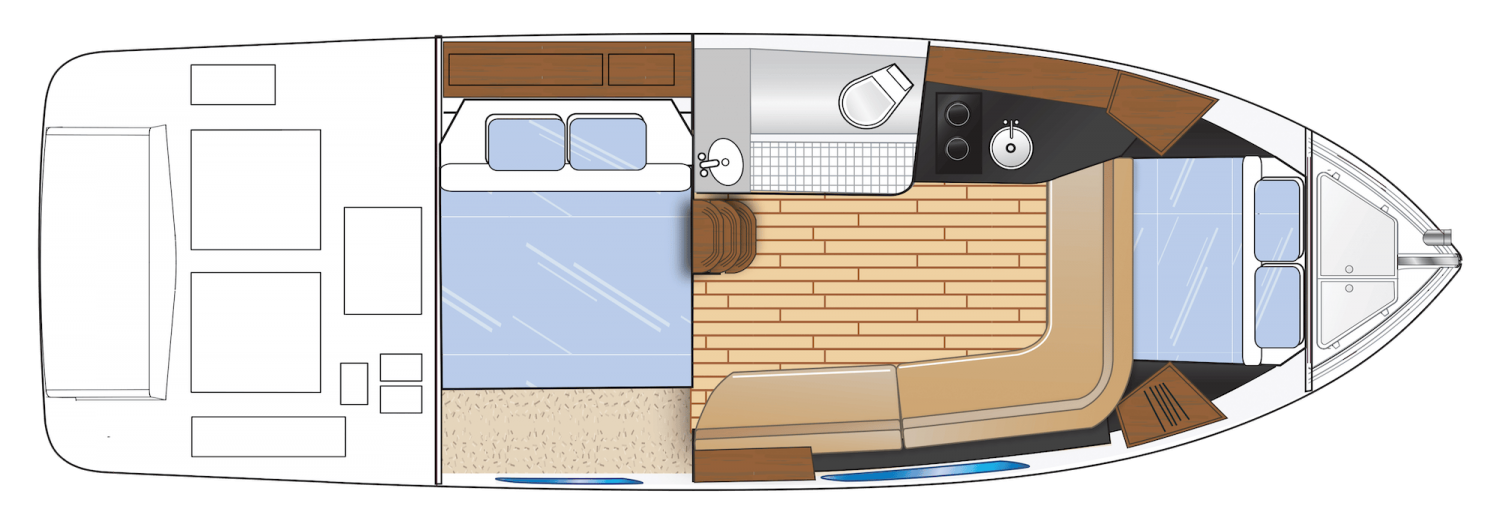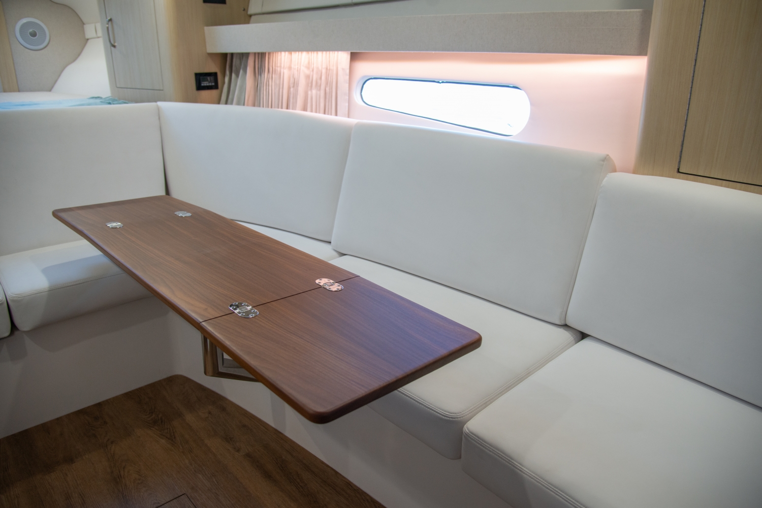 The cabin below features a luxurious and accommodating galley that is sure to impress and please again and again. Equipped with two0burner stove, sink, refrigerator, microwave and plenty of storage space, the 33's galley has everything you need.