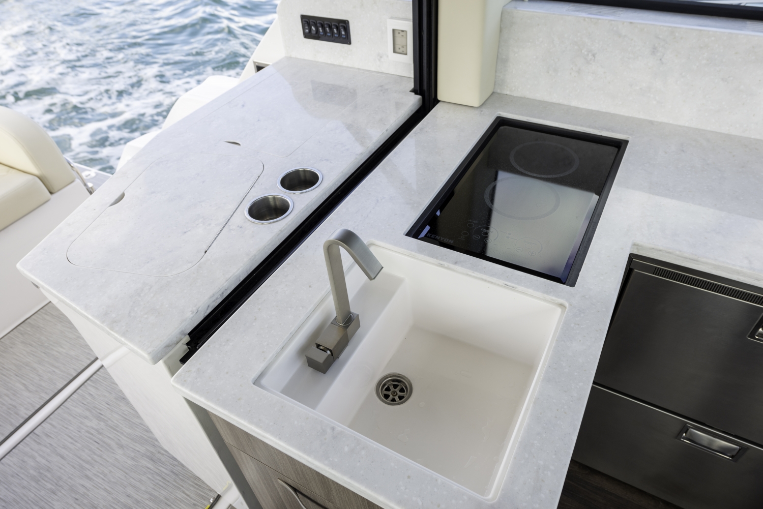 Lay back and enjoy the sunshine or sit up and watch the water on the mulitposition foredeck sunpad. The optional cabana is perfect if you love the view but want some shade.