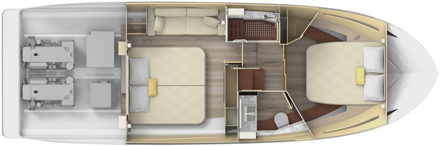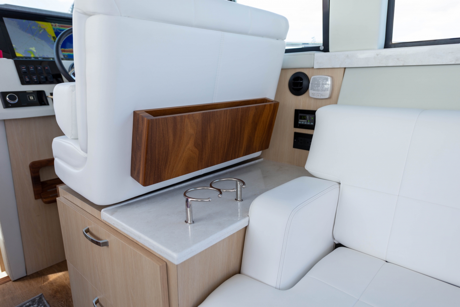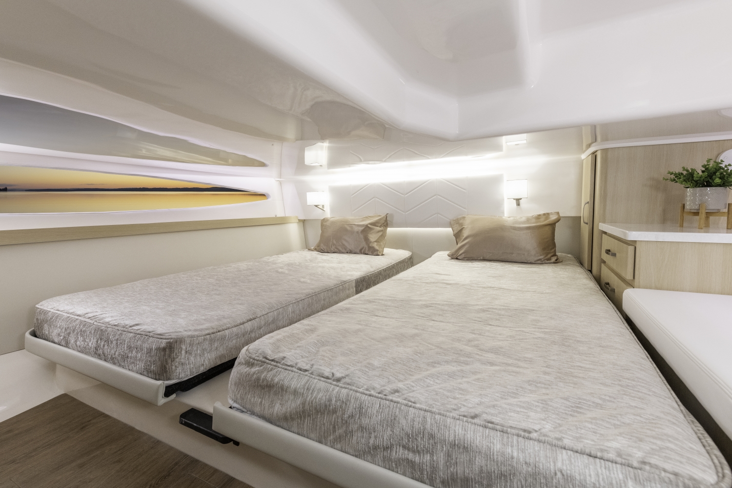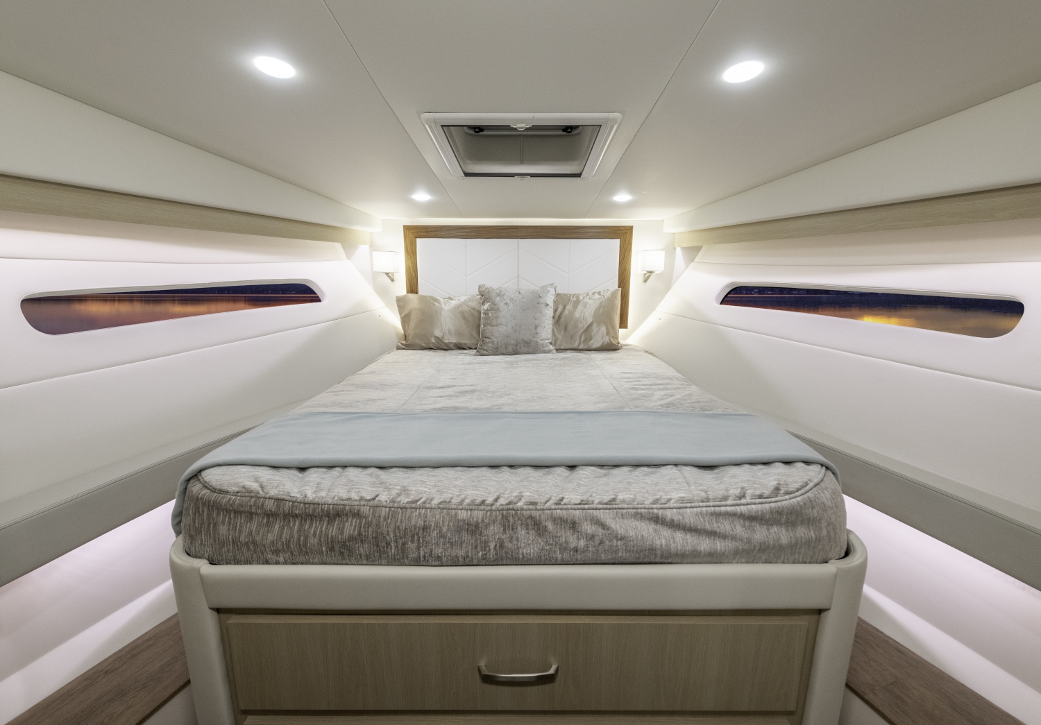 The 38 Grande Coupe was designed for clear views and natural light from the cabin to the upper salon. Thanks to large single-pane windows, the upper salon features 360° views, and with hull side windows, your cabin will be flowing with natural light.