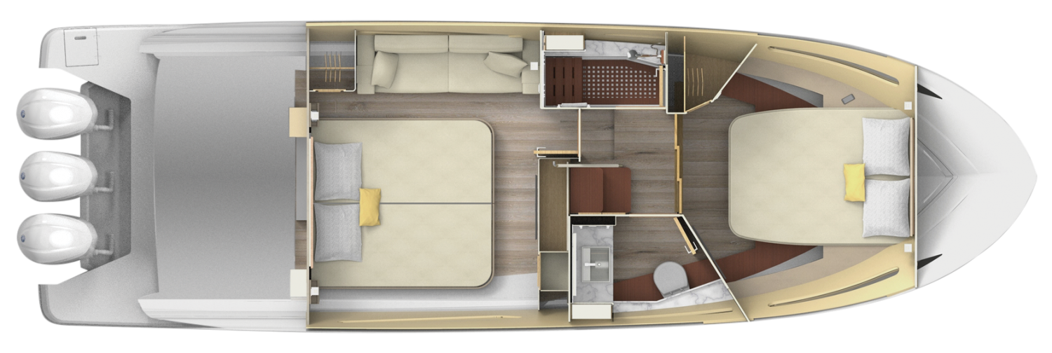 The aft stateroom features a full-size king bed with plenty of walk-around space that can easily be converted into two twin bedds.