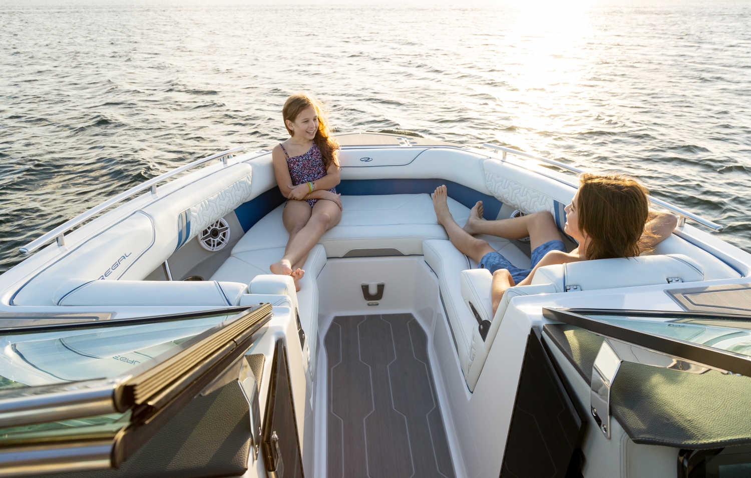 The LS9 Surf features best-in-class surfing thanks to the Regal surf system. 2,500 lbs of ballast, custom wave shaping tabs. Volvo Penta's forward drive and dual 12" glass cockpit water sports displays combine to create the ultimate surfing experience.